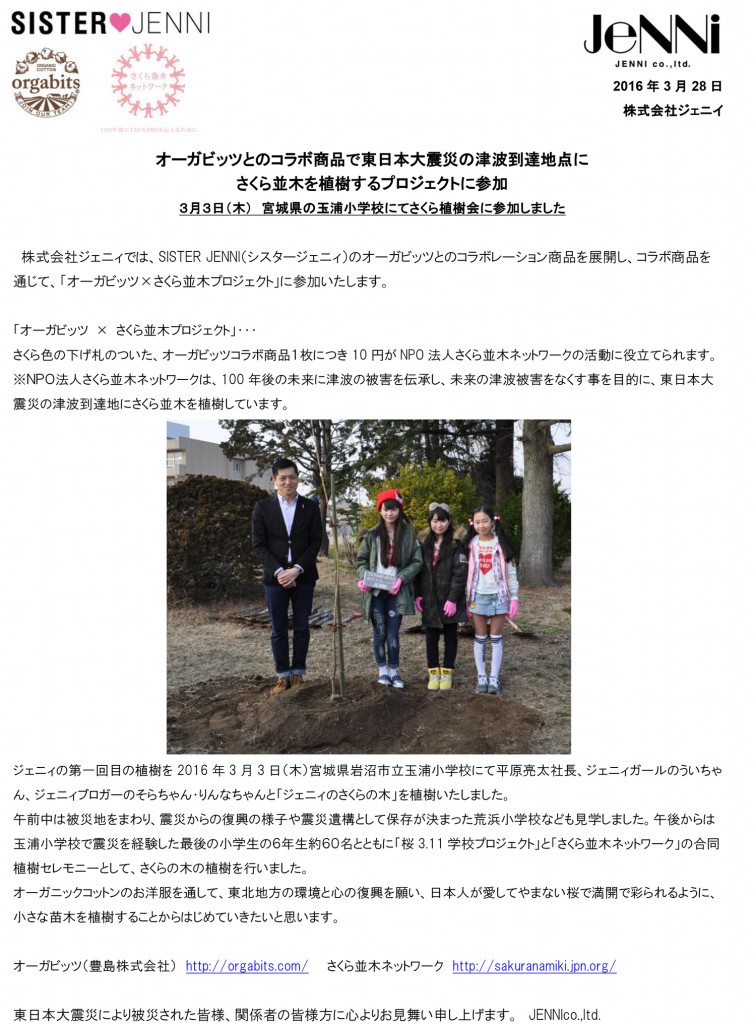 オーガビッツとのコラボ商品で東日本大震災の津波到達地点に さくら並木を植樹するプロジェクトに参加